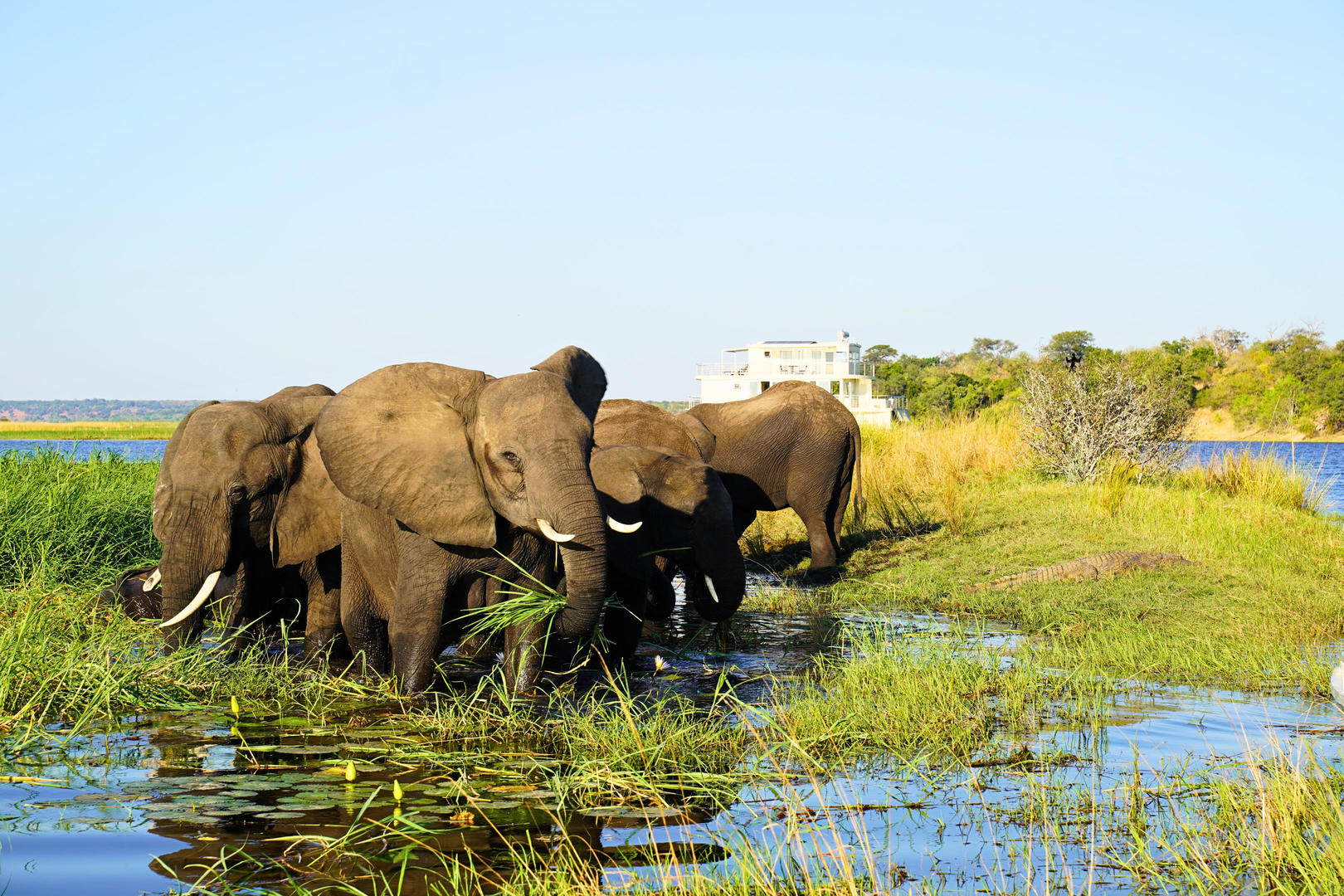 Discover one of Africa’s most remarkable safari regions where the borders of Botswana, Namibia, Zambia and Zimbabwe converge. Along the legendary Chobe River, wildlife gathers in extraordinary numbers, creating one of the most spectacular safari landscapes on the continent. This unique experience blends the thrill of safari with the serenity of life on the water. Guests glide along the river aboard elegant floating lodges and boutique safari boats, watching elephants gather on the riverbanks, hippos drift through the water and fish eagles circle overhead.